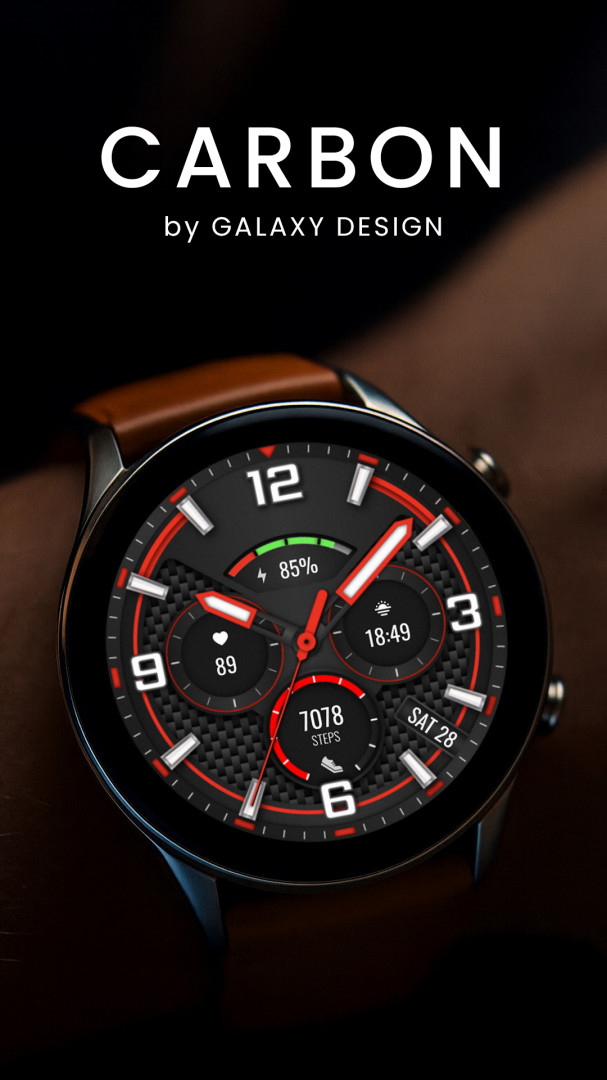 Carbon is a bold analog watch face built for precision, performance, and modern style. Featuring a sleek carbon fiber texture, high-contrast elements, and deep customization, it delivers a powerful look with everyday functionality.
