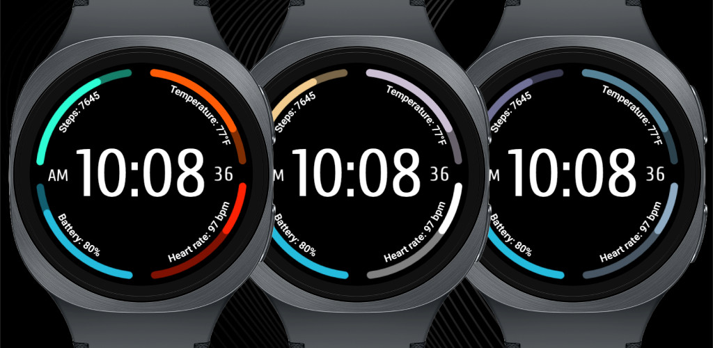 Get CouponThis watch face features a modern, sports-oriented layout that presents essential data through a clean, minimalistic interface. A bold digital clock sits at the center for immediate readability, framed by four functional arcs that track steps, heart rate, and battery life, while the last arc displays the current temperature reading.