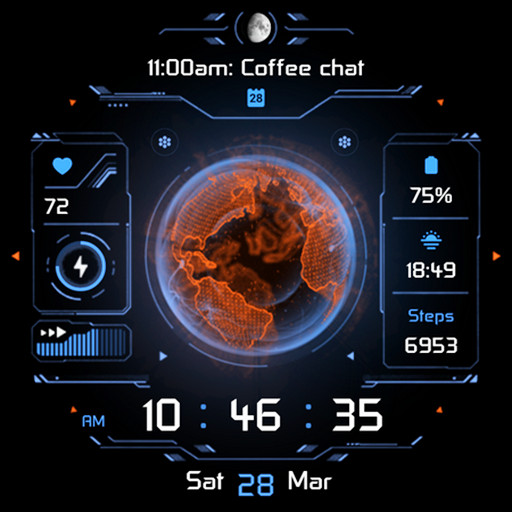 Spheracus is an animated futuristic digital watch face with useful health indicators and tons of customization options. Animated high-tech hub features a rotating holographic Earth at the center, with tons of customizable indicators and shortcuts around it. Customizable elements include colors, indicators, app shortcuts and Always-on display - allowing you to create your ideal layout!