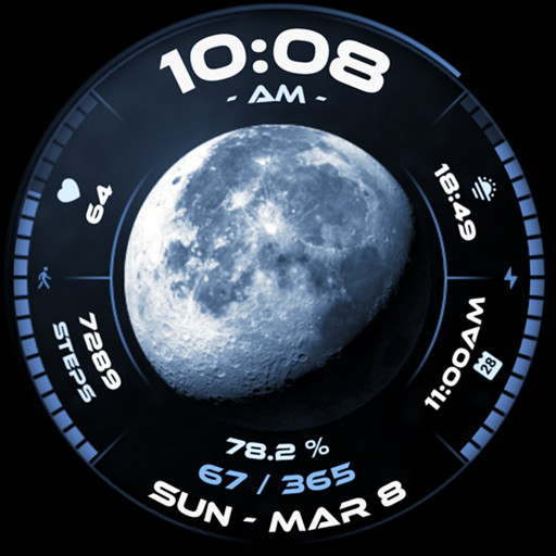 Lunar Rim is a modern Lunar digital watch face with a futuristic circular layout. Featuring highly-detailed realistic Moon phase indicator, stunning colors and lots of customization! Detailed Moon phase images from NASA - each of the 28 Moon phase images is an actual high-definition photograph of our Moon, provided by NASA. Accurate view of the current Moon phase at all times, constantly updating and changing throughout the day.